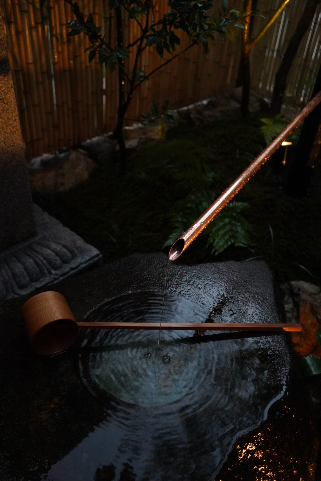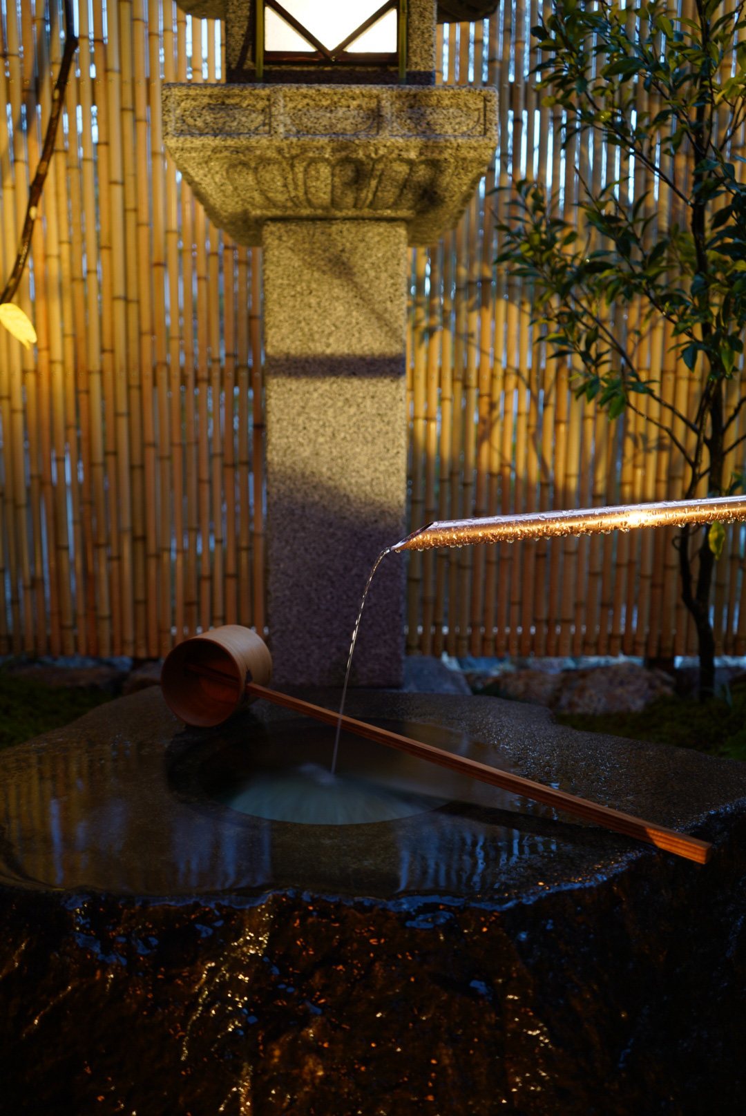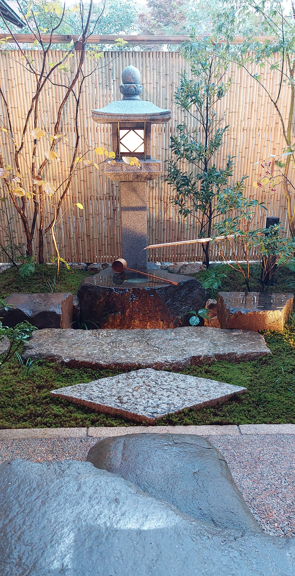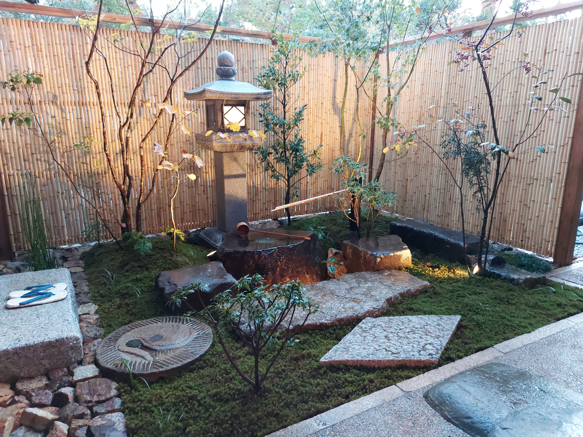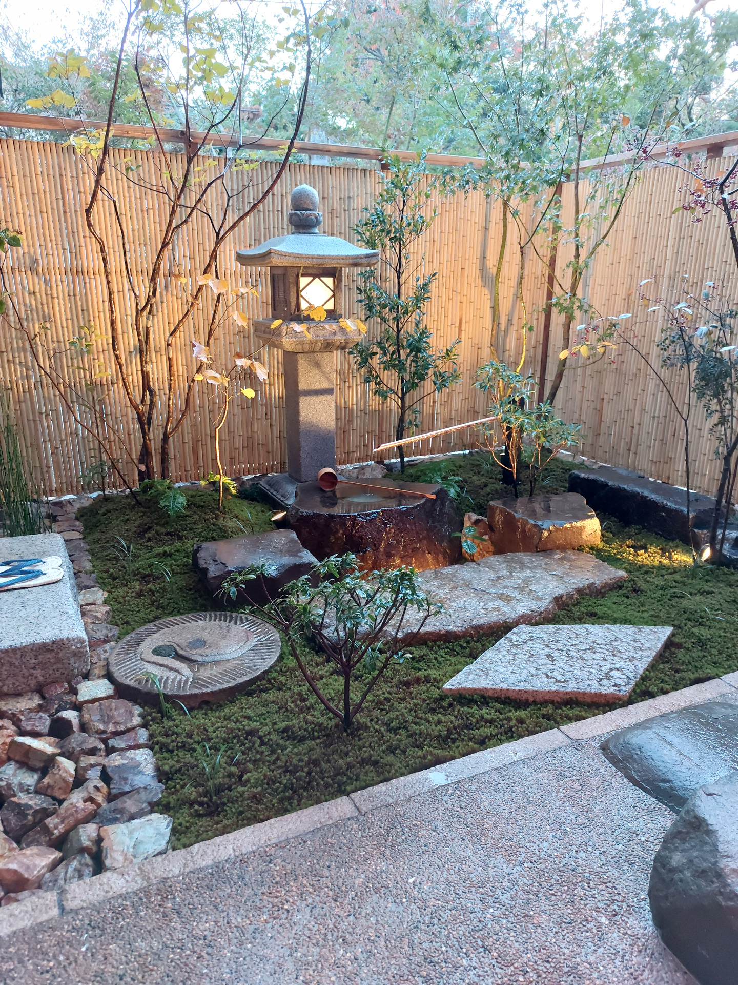M邸 坪庭 オーナー様は全国に人脈をお持ちの方です。 毎日のように経営者、数奇者、文化人の方々がいらっしゃいます。 "私に会いに来てくれる人を感動させたい。そのような庭を作ってほしい" 私に託してくれた言葉です。 建物は数奇屋建築を随所に取り入れてあり、城下町である小田原の大名屋敷通りに位置します。 そして、この地は"お茶文化"が深く、オーナー様自身がそれを取り入れたおもてなしがしたいということ。 そのようなことからヒントを得て作庭に挑みました。 茶道流派を問わない蹲踞組をし、前石には珍しい大判石を使用しました。 樹木は里木と雑木を使い季節に合わせて花や実を楽しめるように植栽しました。 手水鉢に注がれる水、その源となる筧は竹ではなく銅を使用し、ここぞというお招きの際ピンクゴールドの如く磨きあげるというおもてなし精神を取り入れました。 菱形にカットした板石(電板)から蹲踞、石灯籠と全て中心線を合わせており、茶庭では見ることのないシンメトリーなデザインとなっています。 此処を訪れた方々が感動する=オーナー様の感動と喜び改めてそれを実感することができました。