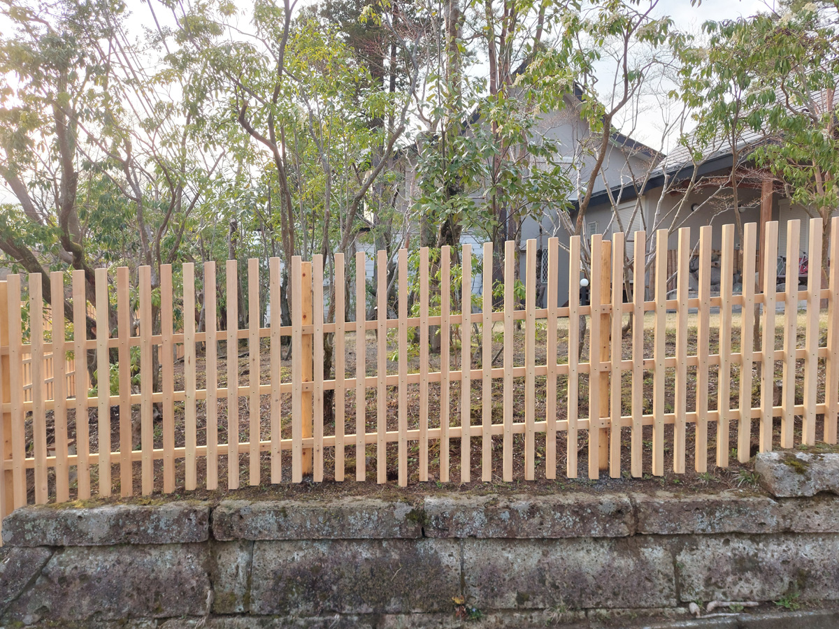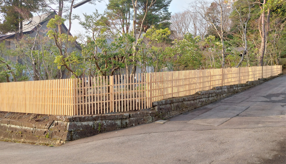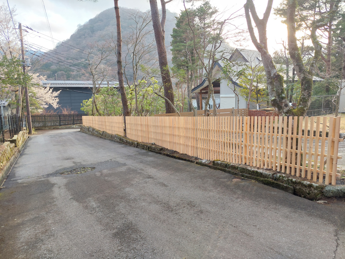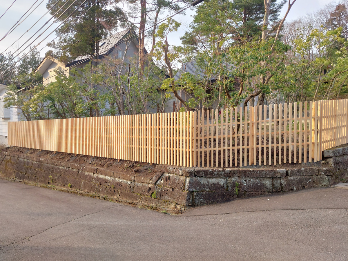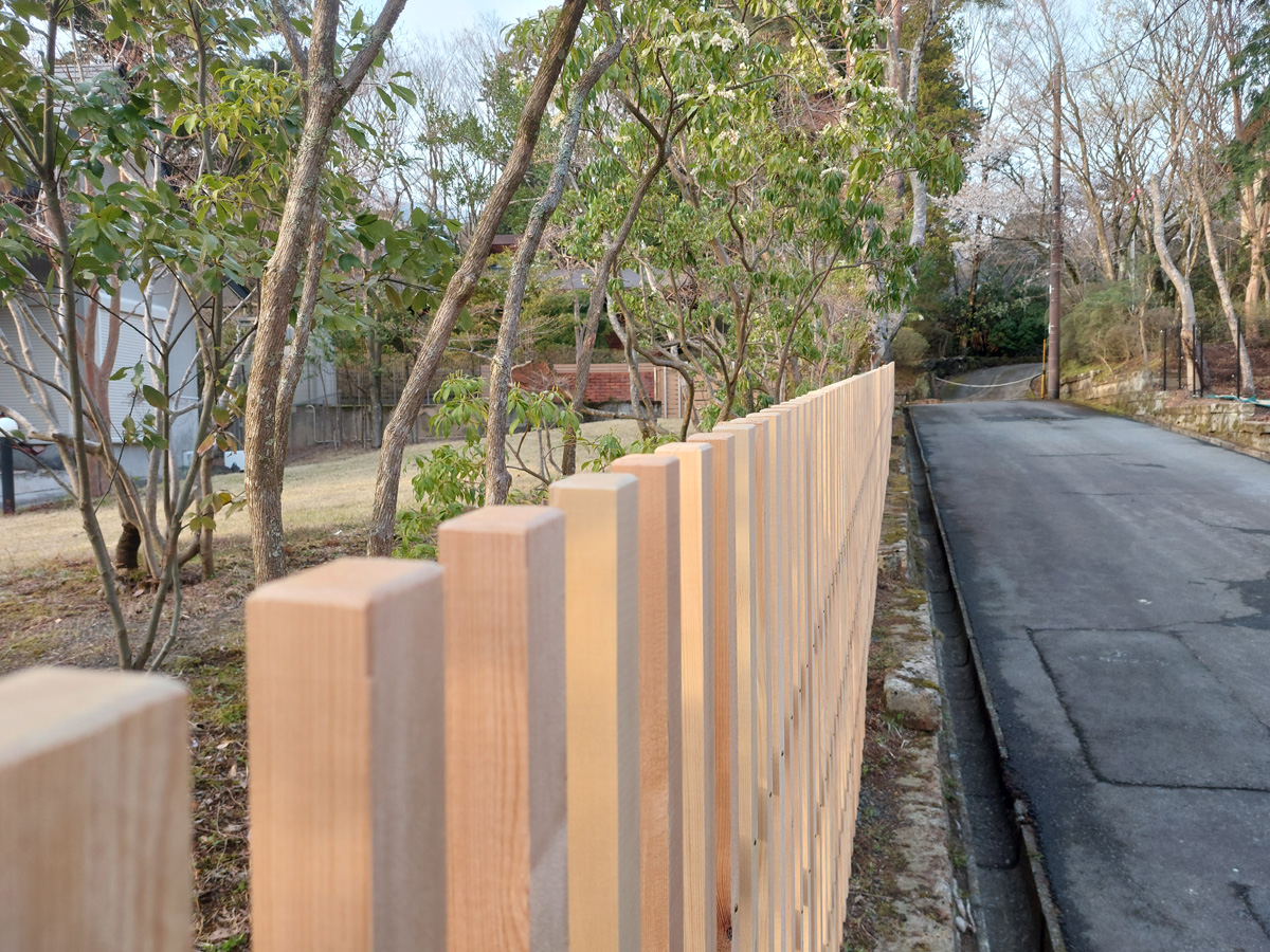 白木格子塀 全長約50mにも及ぶ長い塀を制作。 美しい白木に特別な防腐塗装を施すことでより耐久性のある形に仕上げました。 また、年月が経って白木の色が段々と変化を重ねてきた時、その色合いに合わせた防腐塗装を施すことで、また違った雰囲気を愉しむこともできるはず。